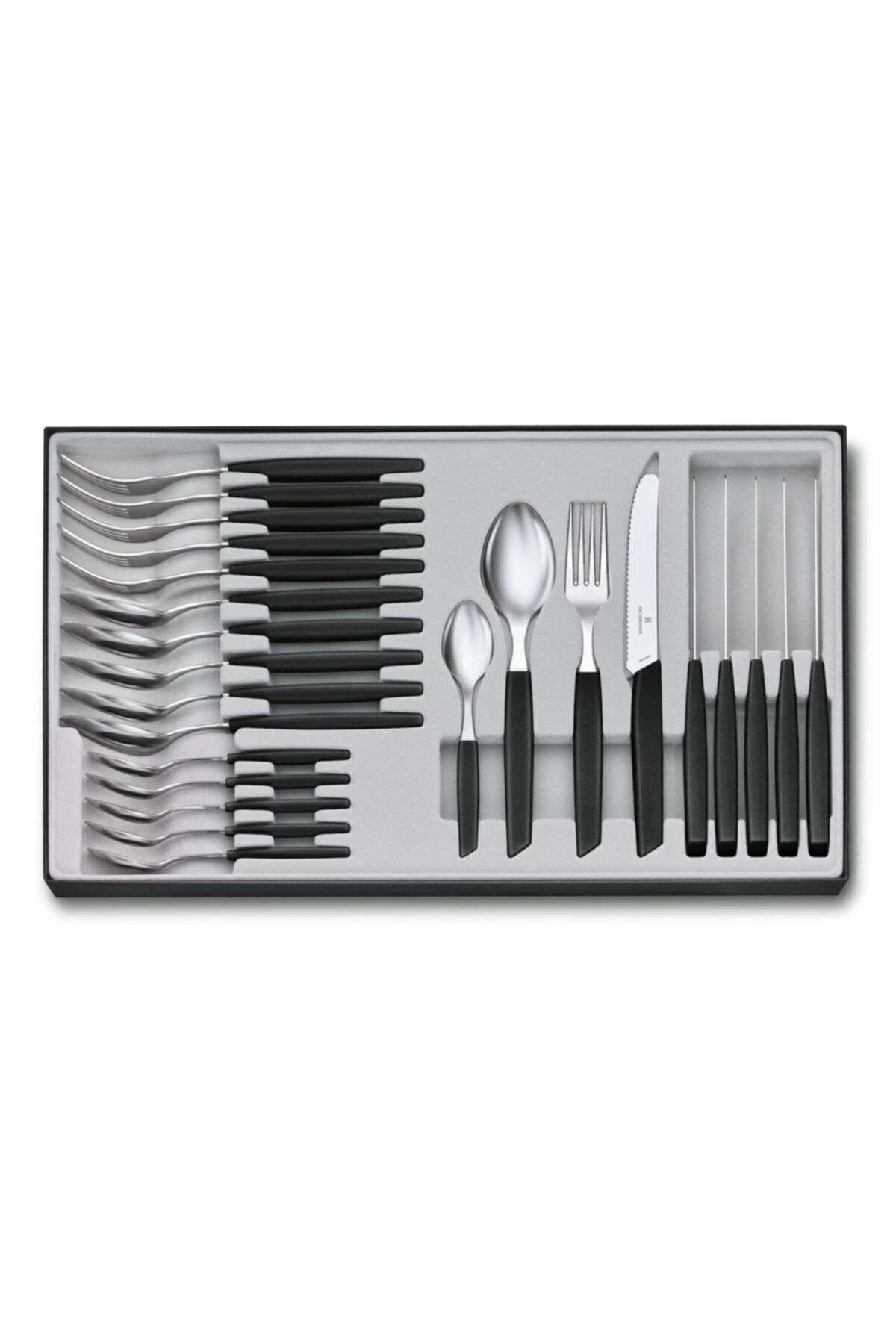 مجموعه 24 عددی میز غذاخوری همراه با چاقوی دندانه دار نوک گرد ویکتورینوکس دسته مشکی 6.9093.11W.24