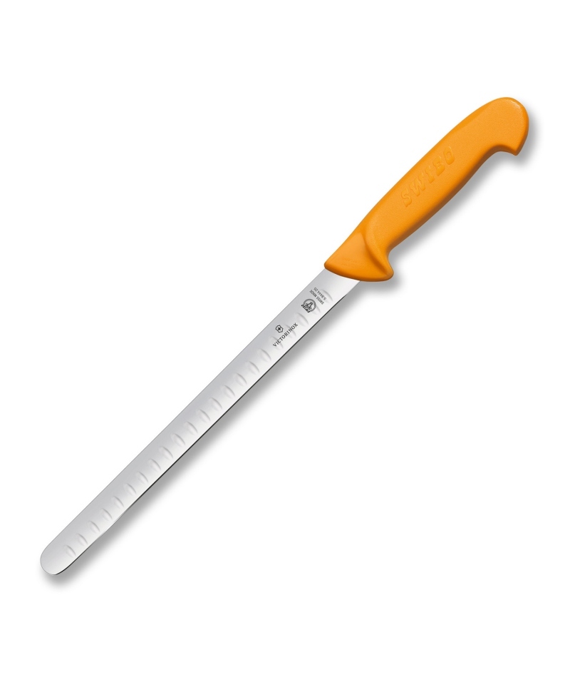 چاقوی قصابی سوییبو ویکتورینوکس دسته نارنجی تیغه شیاردار و نوک گرد 25سانتی 5.8444.25