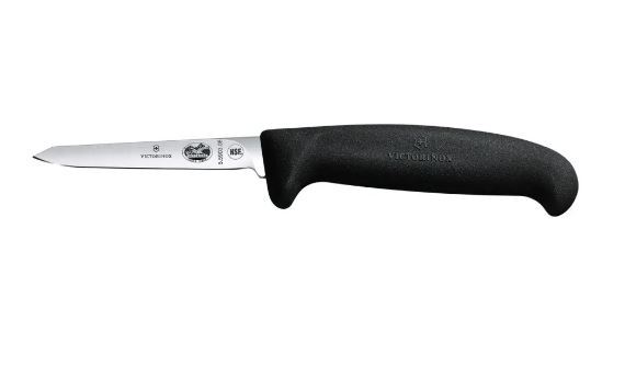 چاقوی مرغ ویکتورینوکس مدل 5.5903.08، با تیغه ۸ سانتی‌متری و نوک کج خود، ابزاری بی‌نظیر برای استخوان‌گیری دقیق و ظریف طیور است. تیغه استیل با کربن بالا، دوام و تیزی فوق‌العاده‌ای را ارائه می‌دهد، که برای حفظ لبه و مقاومت در برابر زنگ‌زدگی و خوردگی در طول زمان بسیار مهم است. نوک کج آن امکان نفوذ آسان به نقاط تنگ و جدا کردن گوشت از استخوان را با حداقل ضایعات فراهم می‌کند، که برای استخوان‌گیری دقیق در اطراف مفاصل طیور ایده‌آل است.   دسته ارگونومیک فیبروکس پرو مشکی، چسبندگی محکم و ایمنی را در حین کار تضمین می‌کند. این دسته به گونه‌ای طراحی شده است که حتی در محیط‌های مرطوب یا چرب نیز ضد لغزش باشد و راحتی کاربر را در طول شیفت‌های کاری طولانی فراهم آورد. این چاقو همچنین دارای گواهی NSF است که انطباق آن با استانداردهای سخت‌گیرانه بهداشتی و ایمنی را برای استفاده در محیط‌های فرآوری مواد غذایی و آشپزخانه‌های تجاری تأیید می‌کند.