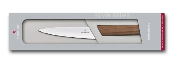 چاقوی سرآشپز سوئیس مدرن ویکتورینوکس مدل 6.9010.15G با دسته چوب گردو، دستیاری ایدهآل برای آشپزخانه شماست. این چاقوی جمعوجور و سنتی، به راحتی انواع مواد غذایی را برش میدهد. تیغه باریک و نوکتیز آن از جنس فولاد ضد زنگ مقاوم در برابر سایش، برای کارهای دقیقتر مانند پوست کندن، حذف ساقه یا هسته بسیار مناسب است. دسته این چاقو، مانند سایر چاقوهای مجموعه Swiss Modern، دارای فرم ارگونومیک خاصی با چوب گردوی اروپایی با دانههای غنی است. گرمی و طبیعی بودن چوب گردو، هر دسته را منحصر به فرد میکند و شکل هندسی آن، حسی صاف و مدرن به این چاقوی ۱۵ سانتیمتری میبخشد. ظرافت و کارایی بالا در این ابزار آشپزخانه زیبا، بادوام و جاودانه ترکیب شدهاند.