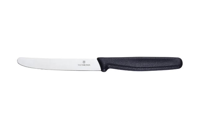 چاقوی رومیزی ۱۱ سانتیمتری (۴.۵ اینچی) ویکتورینوکس 5.1303 با لبه صاف و نوک گرد، ابزاری مهندسی شده برای دقت در آشپزخانه و روی میز غذا است. این چاقو به راحتی از انواع میوهها و سبزیجات مانند کیوی، انار، بادمجان و کدو سبز عبور میکند و برشهایی تمیز و دقیق را ارائه میدهد. دسته مشکی آن از جنس پلاستیک/پلیپروپیلن، راحتی و دوام را تضمین میکند و بهداشتی است. این چاقو اغلب در بستههای چندتایی (مانند ۶ عددی) عرضه میشود که آن را برای استفاده در خانواده یا رستورانها مناسب میسازد.