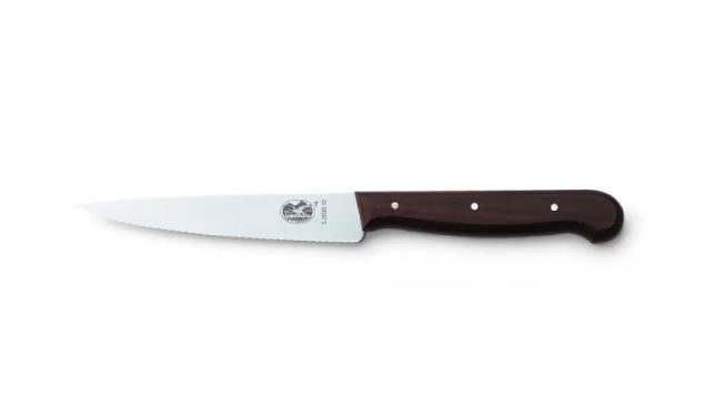 چاقوی استاندارد آشپزخانه victorinox با دسته چوبی قهوه ای تیره و تیغه اره ای 12 سانتی 5.2030.12