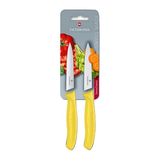 مجموعه دو عددی چاقو ویکتورینوکس دسته زرد و تیغه دندانه دار و ساده 10 سانتی 6.7796.L8B