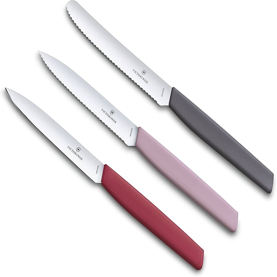 ست چاقوی پارینگ 3 تکه Victorinox Swiss Modern با کد 6.9096.3L2، یک مجموعه چاقوی چندکاره از Trend Colors 2022 است که رنگ‌های شاد و هماهنگ را به آشپزخانه شما می‌آورد. این ست شامل سه چاقوی همه‌کاره از مجموعه محبوب Swiss Modern با تیغه‌های فوق‌العاده تیز و دسته‌های ارگونومیک است که برای آماده‌سازی بی‌دردسر و تیزی در سطح حرفه‌ای طراحی شده‌اند.   این چاقوها با رنگ‌های متنوع و مدرن (فلفلی، لیلاک، بری) که به عنوان مجموعه Flower شناخته می‌شوند، جلوه‌ای زیبا و معاصر به آشپزخانه شما می‌بخشند. طراحی ارگونومیک دسته‌ها، راحتی بی‌نظیری را در حین استفاده فراهم می‌کند و به خوبی در انحنای کف دست جای می‌گیرد. تیغه‌ها از فولاد ضد زنگ (316L surgical-grade, rust-free stainless steel) ساخته شده‌اند که فوق‌العاده تیز، مقاوم در برابر سایش و به راحتی قابل تیز کردن مجدد هستند و برای یک عمر دوام طراحی شده‌اند. دسته‌ها از پلی‌پروپیلن کوپلیمر (PPC) ساخته شده‌اند که محکم، سفت و سخت است و می‌تواند استریل شود.