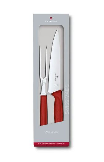 ست چاقو و چنگال حکاکی 2 تکه Victorinox Swiss Classic قرمز – 6.7131.2G این ست شامل یک چاقوی حکاکی و یک چنگال حکاکی با دسته‌های ارگونومیک است که برای برش بی‌دردسر گوشت طراحی شده‌اند.   برای گوشت‌های ارگانیک و مرغ‌های پرورشی، ابزاری درخور نیاز است. ست چاقو و چنگال حکاکی 2 تکه Victorinox Swiss Classic را ملاقات کنید. این ست دو تکه، تجربه حکاکی را بدون زحمت ارتقا می‌بخشد. با چاقوی 19 سانتی‌متری آن، برش بزنید، تکه کنید و حکاکی کنید. چنگال 15 سانتی‌متری نیز به عنوان شریک طبیعی آن، همه چیز را روی تخته ثابت نگه می‌دارد. هر دو ابزار دارای دسته‌های ارگونومیک Swiss Classic برای چسبندگی استثنایی هستند که حکاکی را آسان و لذت‌بخش می‌کنند و به کاربران امکان می‌دهند با ثبات کامل روی تخته برش کار کنند.